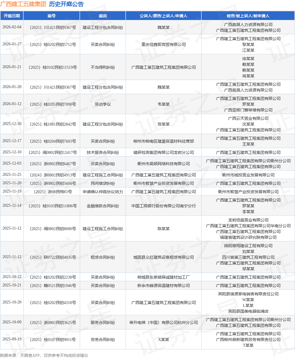 案号:(2025)闽0802民初12417号根据统计,近一年内以广西建工第五建筑工程集团有限公司为当事人的历史开庭公告有125则,其中案由为“建设工程施工合同纠纷”的公告以34则居首,其次为“买卖合同纠纷”有27则,“建设工程分包合同纠纷”有11则。历史开庭公告(前20条)如下: