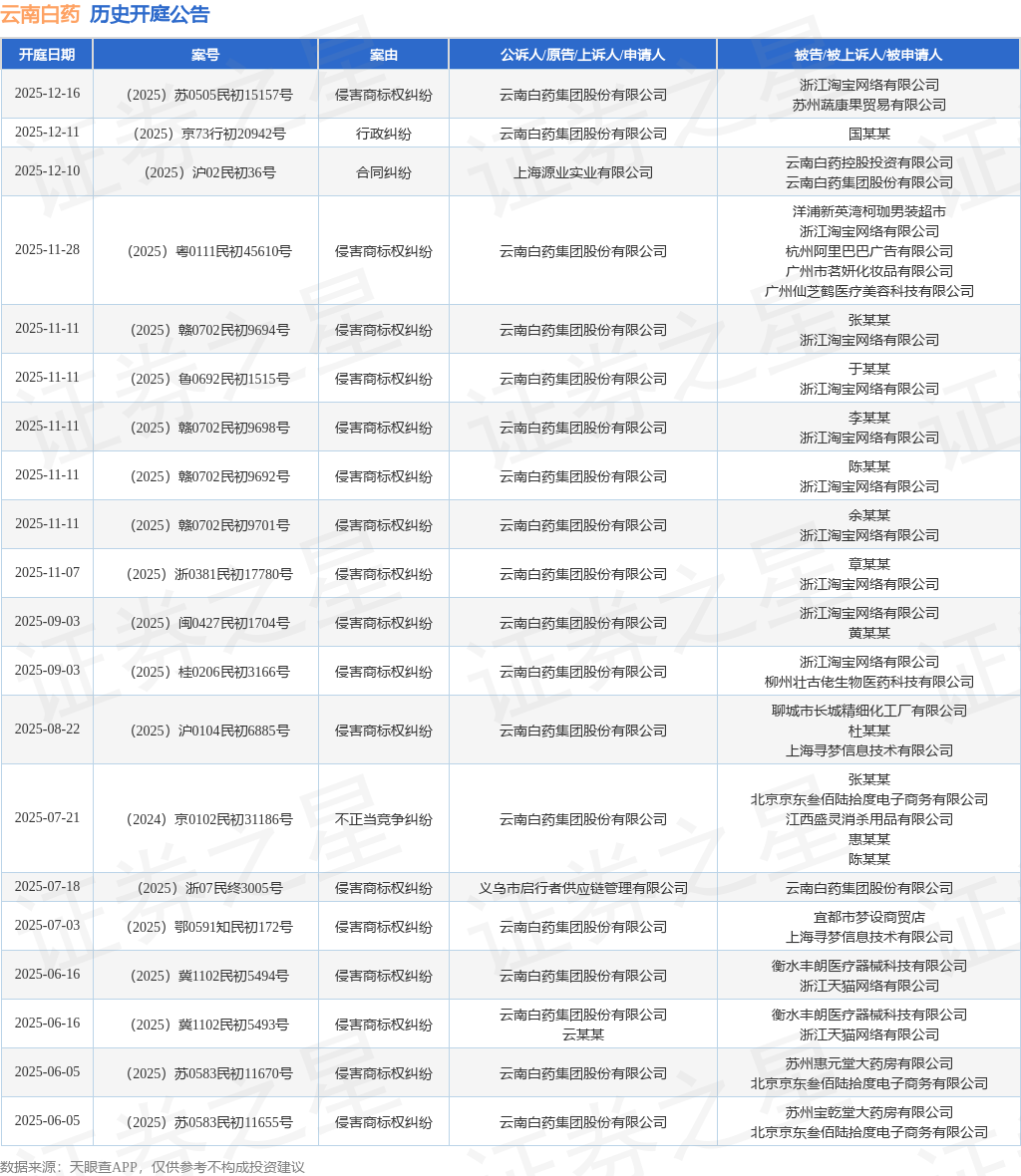 案号:(2025)沪02民初36号根据统计,近一年内以云南白药集团股份有限公司为当事人的历史开庭公告有31则,其中案由为“侵害商标权纠纷”的公告以27则居首,其次为“不正当竞争纠纷”有1则,“合同纠纷”有1则。历史开庭公告(前20条)如下: