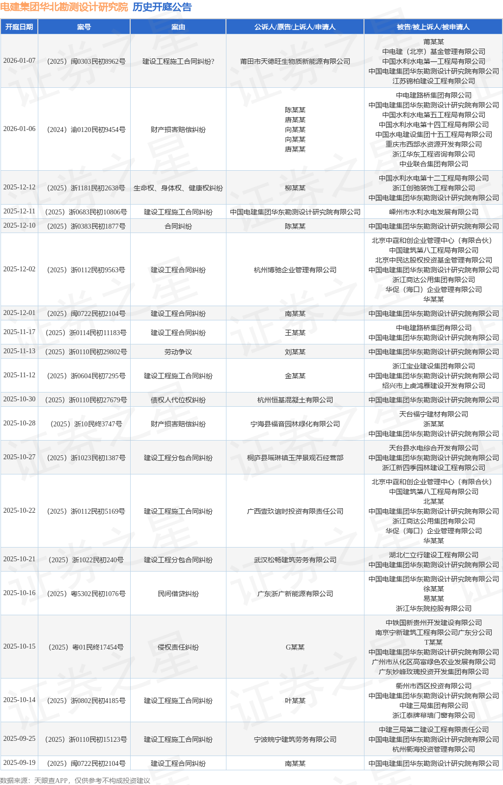 案号:(2025)浙0383民初1877号根据统计,近一年内以中国电建集团华东勘测设计研究院有限公司为当事人的历史开庭公告有97则,其中案由为“建设工程施工合同纠纷”的公告以31则居首,其次为“建设工程分包合同纠纷”有12则,“劳务合同纠纷”有8则。历史开庭公告(前20条)如下: