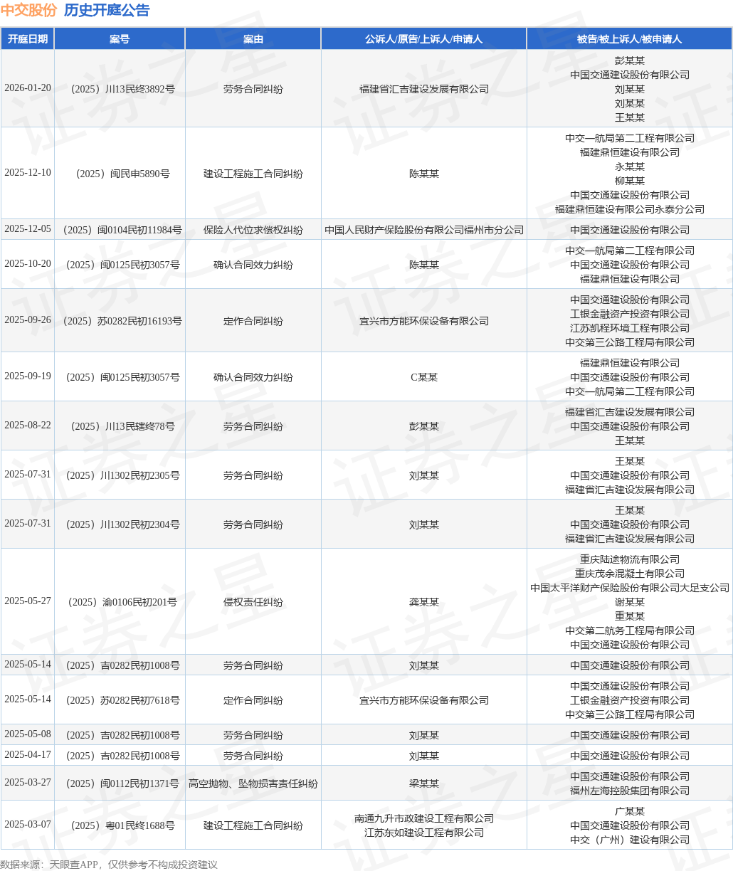 案号:(2025)闽民申5890号根据统计,近一年内以中国交通建设股份有限公司为当事人的历史开庭公告有16则,其中案由为“劳务合同纠纷”的公告以7则居首,其次为“定作合同纠纷”有2则,“建设工程施工合同纠纷”有2则。历史开庭公告如下: