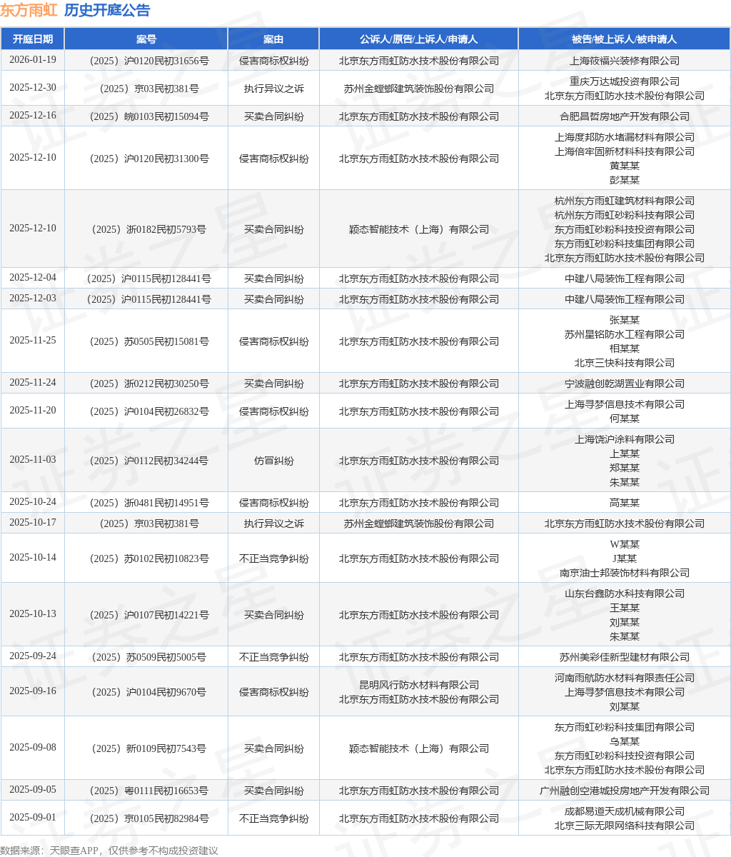 案号:(2025)浙0182民初5793号根据统计,近一年内以北京东方雨虹防水技术股份有限公司为当事人的历史开庭公告有87则,其中案由为“买卖合同纠纷”的公告以31则居首,其次为“侵害商标权纠纷”有17则,“不正当竞争纠纷”有8则。历史开庭公告(前20条)如下: