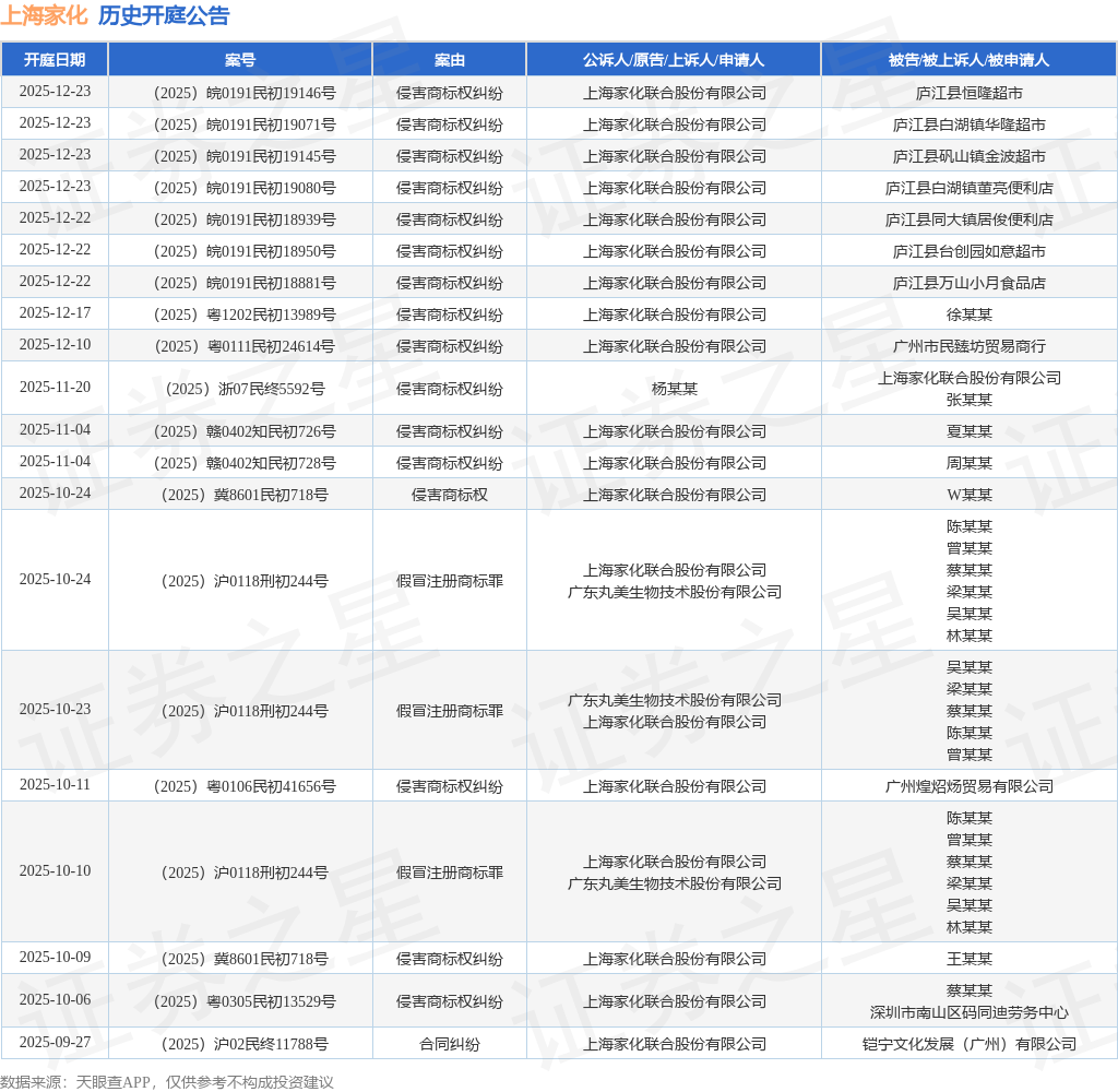 案号:(2025)粤0111民初24614号根据统计,近一年内以上海家化联合股份有限公司为当事人的历史开庭公告有430则,其中案由为“侵害商标权纠纷”的公告以307则居首,其次为“侵害商标权”有44则,“商标权权属、侵权纠纷”有42则。历史开庭公告(前20条)如下: