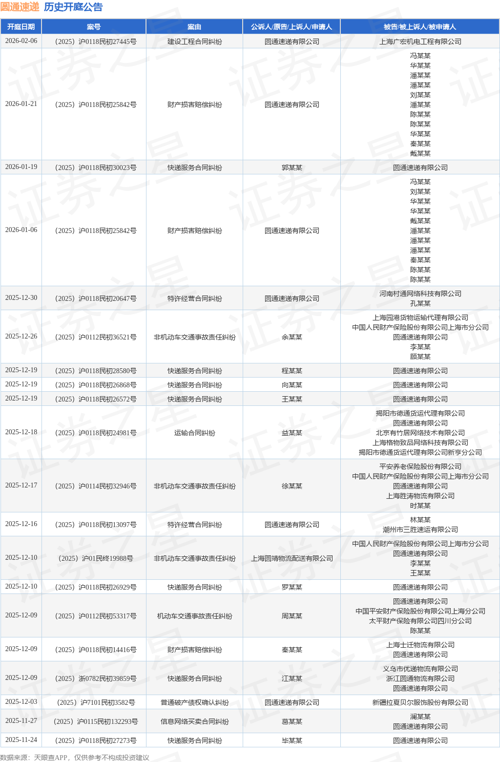 案号:(2025)沪01民终19988号根据统计,近一年内以圆通速递有限公司为当事人的历史开庭公告有162则,其中案由为“快递服务合同纠纷”的公告以39则居首,其次为“特许经营合同纠纷”有23则,“非机动车交通事故责任纠纷”有16则。历史开庭公告(前20条)如下: