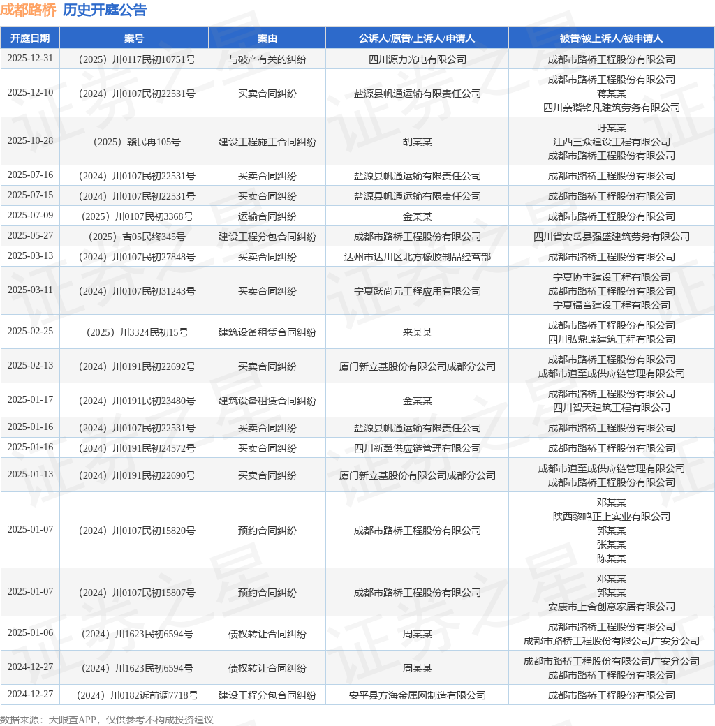 证券之星消息,根据天眼查APP显示,近日公布了一则成都市路桥工程股份有限公司作为被告/被上诉人的开庭公告,详细内容如下: