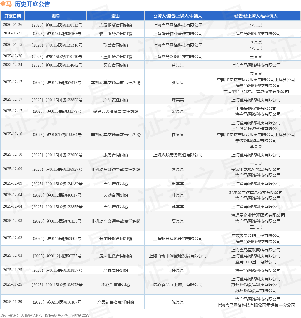 案号:(2025)沪0107民初19964号根据统计,近一年内以上海盒马网络科技有限公司为当事人的历史开庭公告有163则,其中案由为“买卖合同纠纷”的公告以29则居首,其次为“非机动车交通事故责任纠纷”有28则,“房屋租赁合同纠纷”有25则。历史开庭公告(前20条)如下: