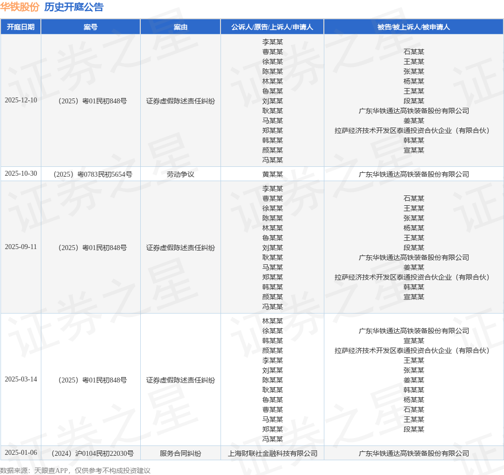 案号:(2025)粤01民初848号根据统计,近一年内以广东华铁通达高铁装备股份有限公司为当事人的历史开庭公告有5则,其中案由为“证券虚假陈述责任纠纷”的公告以3则居首,其次为“劳动争议”有1则,“服务合同纠纷”有1则。历史开庭公告如下: