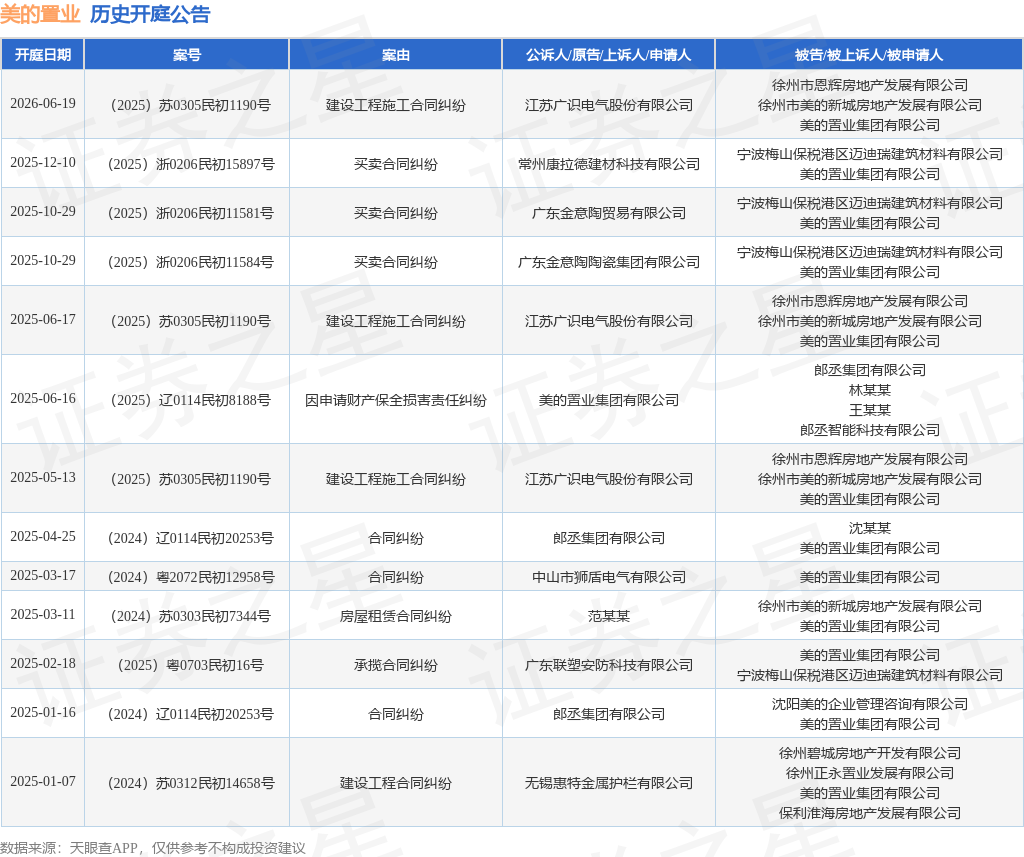 案号:(2025)浙0206民初15897号根据统计,近一年内以美的置业集团有限公司为当事人的历史开庭公告有13则,其中案由为“买卖合同纠纷”的公告以3则居首,其次为“合同纠纷”有3则,“建设工程施工合同纠纷”有3则。历史开庭公告如下: