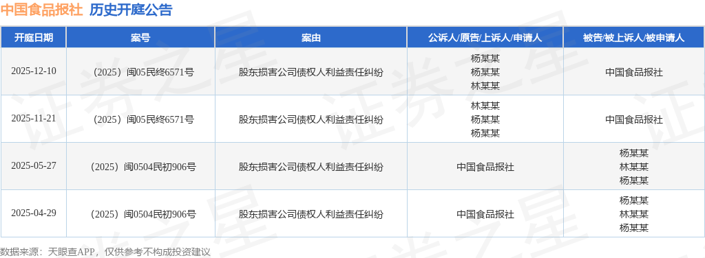根据统计,近一年内以中国食品报社为当事人的历史开庭公告有4则,其中案由为“股东损害公司债权人利益责任纠纷”的公告以4则居首。历史开庭公告如下: