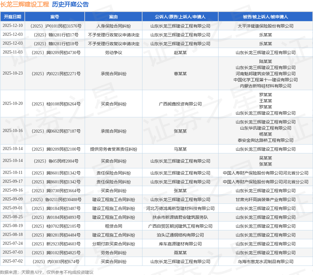 案号:(2025)沪0101民初31576号根据统计,近一年内以山东长龙三辉建设工程有限公司为当事人的历史开庭公告有45则,其中案由为“买卖合同纠纷”的公告以8则居首,其次为“建设工程施工合同纠纷”有6则,“建设工程分包合同纠纷”有5则。历史开庭公告(前20条)如下: