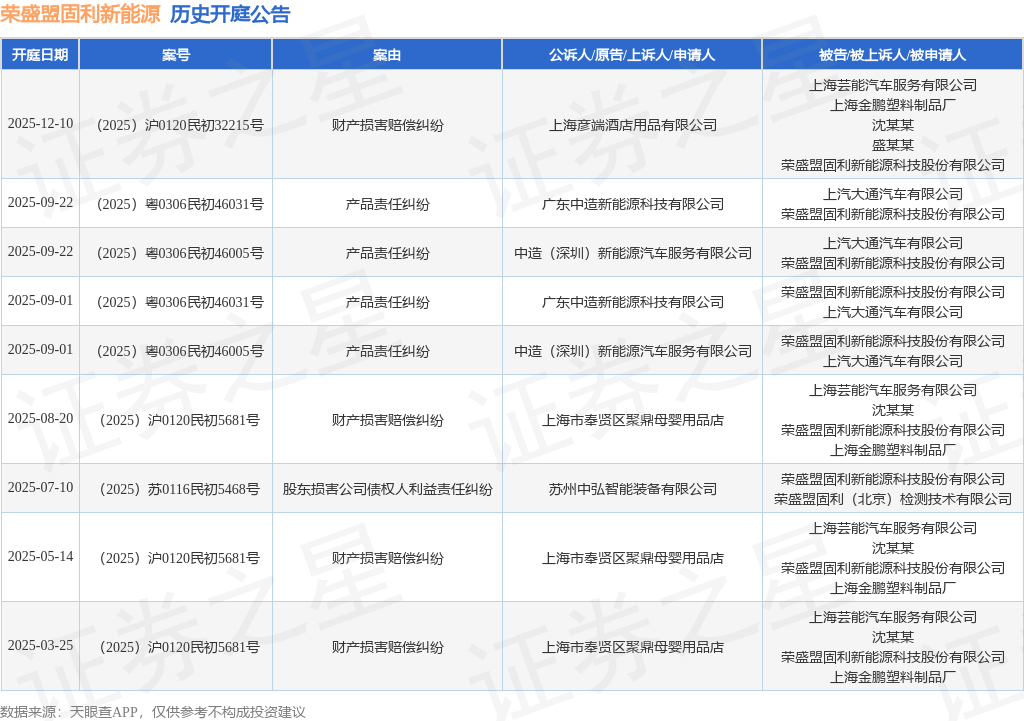 案号:(2025)沪0120民初32215号根据统计,近一年内以荣盛盟固利新能源科技股份有限公司为当事人的历史开庭公告有9则,其中案由为“产品责任纠纷”的公告以4则居首,其次为“财产损害赔偿纠纷”有4则,“股东损害公司债权人利益责任纠纷”有1则。历史开庭公告如下: