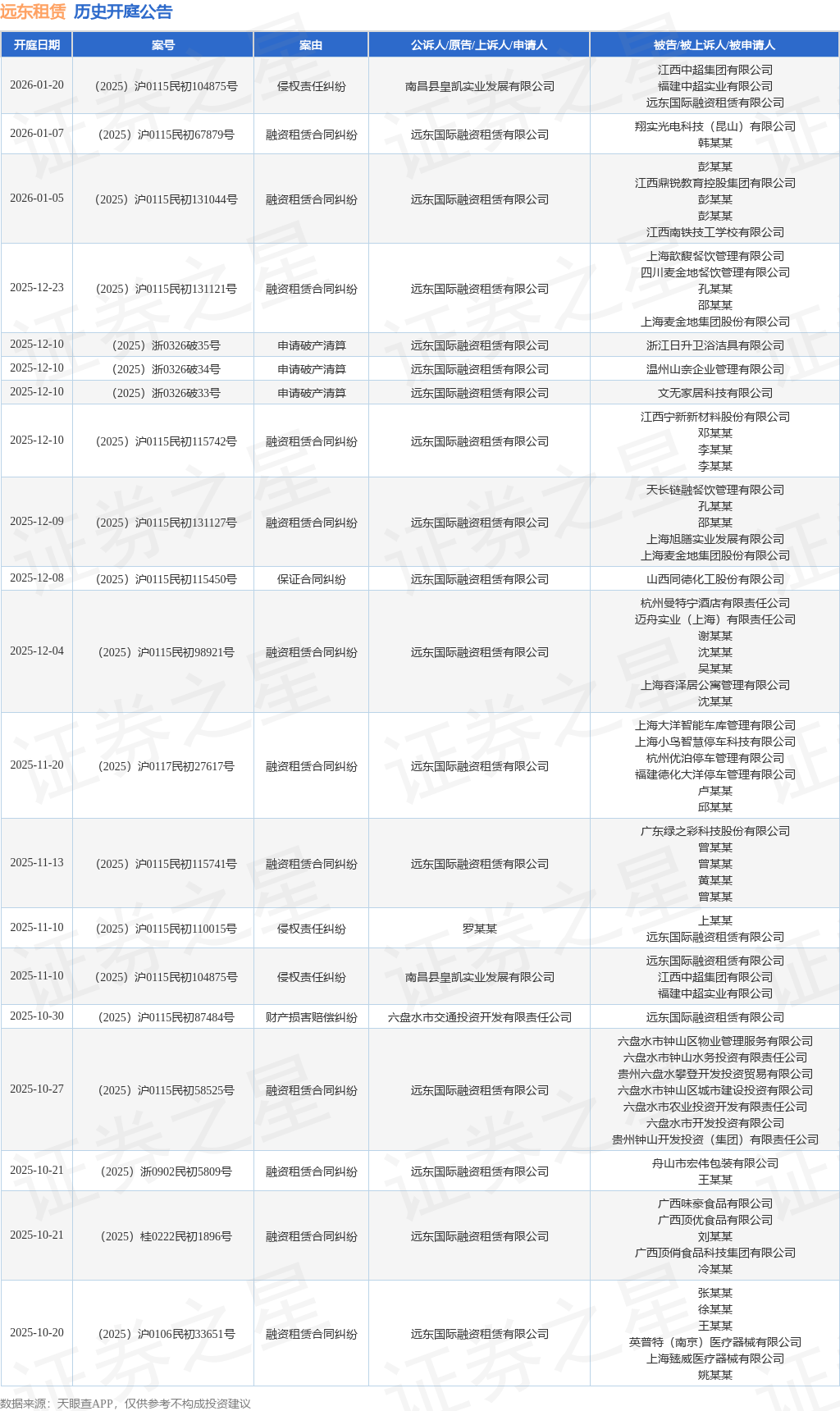 案号:(2025)沪0115民初115742号根据统计,近一年内以远东国际融资租赁有限公司为当事人的历史开庭公告有143则,其中案由为“融资租赁合同纠纷”的公告以114则居首,其次为“与公司有关的纠纷”有4则,“侵权责任纠纷”有3则。历史开庭公告(前20条)如下: