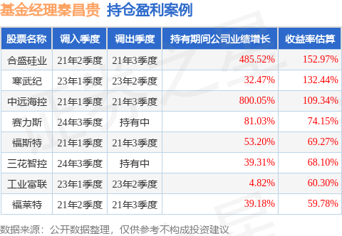 秦昌贵管理的长江量化匠心甄选A基金在21年2季度买入合盛硅业,在持有1个季度后在21年3季度卖出。持有期间的估算收益率为152.97%,持有期间合盛硅业在2020年到2021年的年报归属净利润增幅达485.52%。