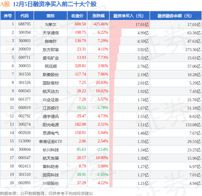 A股融资净买入前三分别为:N摩尔(688795)融资净买入17.01亿元、天孚通信(300394)融资净买入4.99亿元、指南针(300803)融资净买入4.5亿元,前20具体见下表: