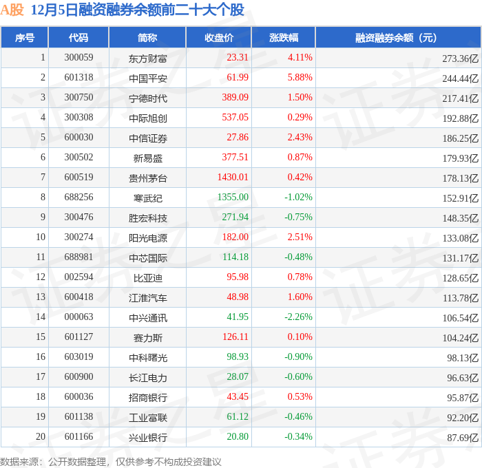 A股融资融券余额前三分别为:东方财富(300059)融资融券余额273.36亿元、中国平安(601318)融资融券余额244.44亿元、宁德时代(300750)融资融券余额217.41亿元,前20具体见下表: