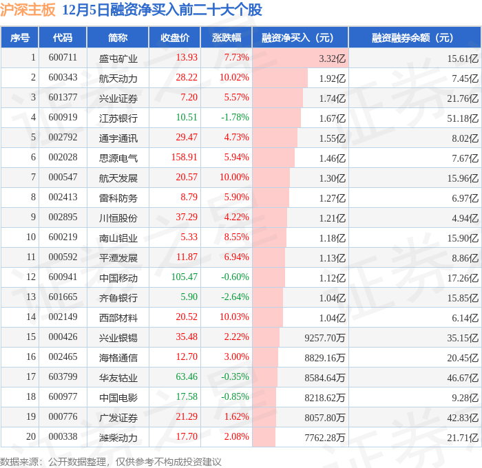 沪深主板融资净买入前三分别为:盛屯矿业(600711)融资净买入3.32亿元、航天动力(600343)融资净买入1.92亿元、兴业证券(601377)融资净买入1.74亿元,前20具体见下表: