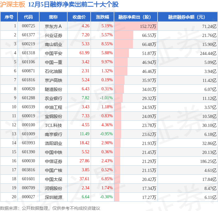 沪深主板融券净卖出前三分别为:京东方A(000725)融券净卖出152.72万股、兴业证券(601377)融券净卖出66.55万股、南山铝业(600219)融券净卖出66.48万股,前20具体见下表: