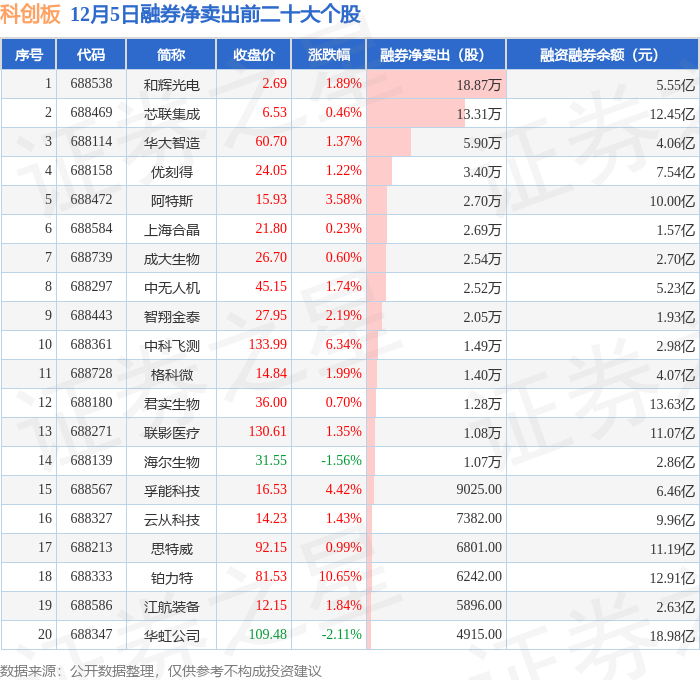 科创板融券净卖出前三分别为:和辉光电(688538)融券净卖出18.87万股、芯联集成(688469)融券净卖出13.31万股、华大智造(688114)融券净卖出5.9万股,前20具体见下表: