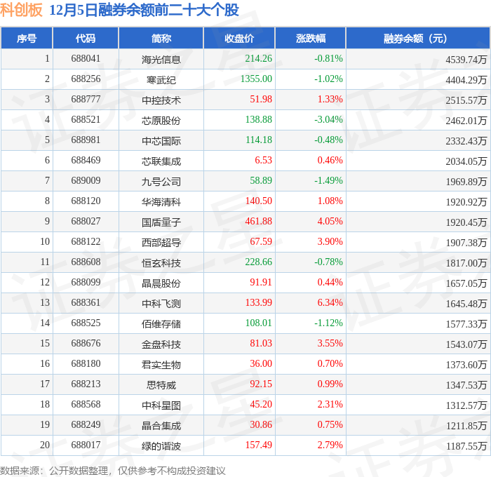 科创板融券余额前三分别为:海光信息(688041)融券余额4539.74万元、寒武纪(688256)融券余额4404.29万元、中控技术(688777)融券余额2515.57万元,前20具体见下表: