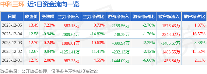 证券之星消息,截至2025年12月5日收盘,中科三环(000970)报收于13.49元,上涨7.23%,换手率4.89%,成交量59.48万手,成交额7.99亿元。