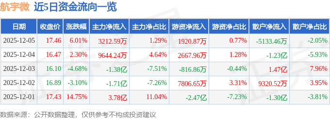 证券之星消息,截至2025年12月5日收盘,航宇微(300053)报收于17.46元,上涨6.01%,换手率22.4%,成交量145.75万手,成交额24.99亿元。