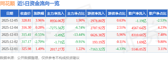 证券之星消息,截至2025年12月5日收盘,同花顺(300033)报收于328.81元,上涨3.96%,换手率5.25%,成交量14.45万手,成交额47.22亿元。