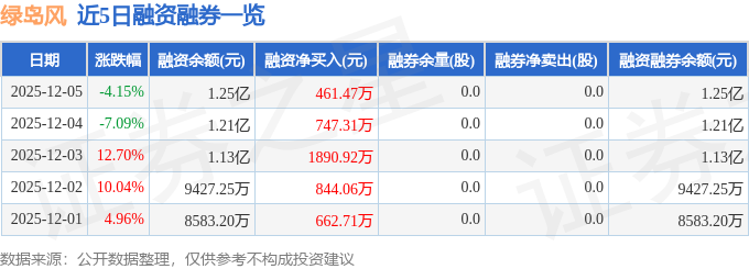 绿岛风融资融券信息显示,融资方面,当日融资买入1863.61万元,融资偿还1402.14万元,融资净买入461.47万元,连续3日净买入累计3099.7万元。融券方面,融券卖出0.0股,融券偿还0.0股,融券余量0.0股,融券余额0.0万元。融资融券余额1.25亿元。