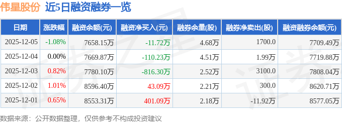 伟星股份融资融券信息显示,融资方面,当日融资买入358.28万元,融资偿还370.0万元,融资净偿还11.72万元。融券方面,融券卖出3700.0股,融券偿还2000.0股,融券余量4.68万股,融券余额51.34万元。融资融券余额7709.49万元。