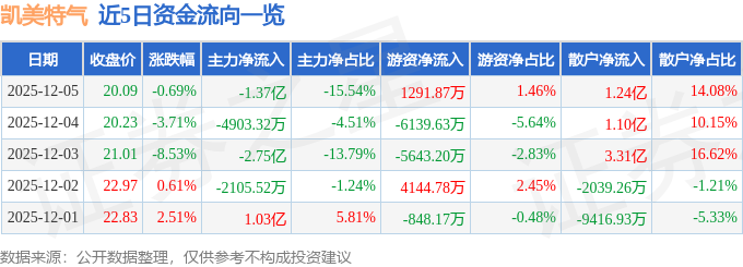 证券之星消息,截至2025年12月5日收盘,凯美特气(002549)报收于20.09元,下跌0.69%,换手率6.39%,成交量44.25万手,成交额8.83亿元。