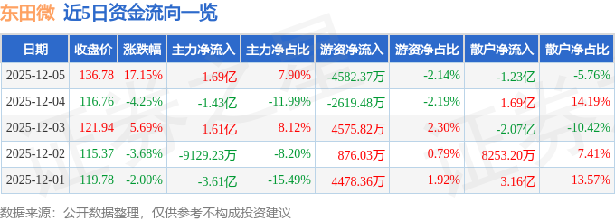 证券之星消息,截至2025年12月5日收盘,东田微(301183)报收于136.78元,上涨17.15%,换手率28.36%,成交量16.63万手,成交额21.39亿元。
