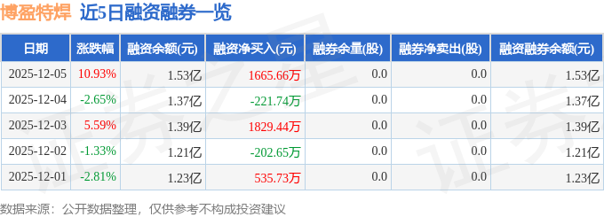 博盈特焊融资融券信息显示,融资方面,当日融资买入5685.69万元,融资偿还4020.02万元,融资净买入1665.66万元。融券方面,融券卖出0.0股,融券偿还0.0股,融券余量0.0股,融券余额0.0万元。融资融券余额1.53亿元。
