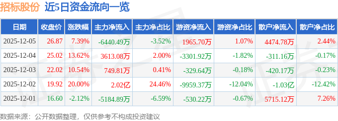 证券之星消息,截至2025年12月5日收盘,招标股份(301136)报收于26.87元,上涨7.39%,换手率26.88%,成交量73.99万手,成交额18.3亿元。