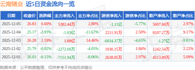 证券之星消息,截至2025年12月5日收盘,云南锗业(002428)报收于26.83元,上涨6.6%,换手率11.09%,成交量72.4万手,成交额19.2亿元。