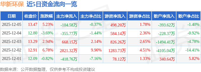 证券之星消息,截至2025年12月5日收盘,华新环保(301265)报收于13.47元,上涨5.23%,换手率12.14%,成交量20.62万手,成交额2.8亿元。
