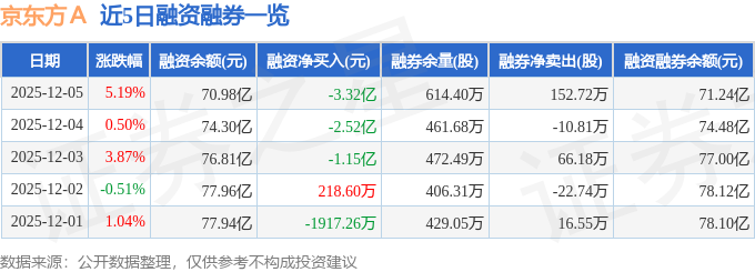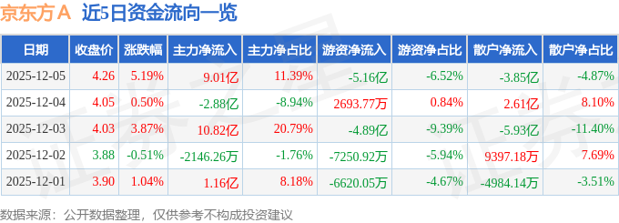 证券之星消息,截至2025年12月5日收盘,京东方A(000725)报收于4.26元,上涨5.19%,换手率5.18%,成交量1900.14万手,成交额79.14亿元。