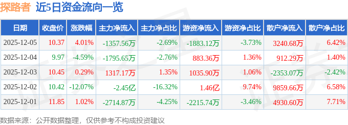 证券之星消息,截至2025年12月5日收盘,探路者(300005)报收于10.37元,上涨4.01%,换手率5.56%,成交量49.16万手,成交额5.05亿元。