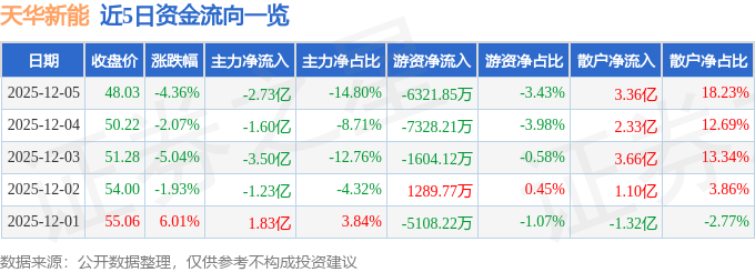 证券之星消息,截至2025年12月5日收盘,天华新能(300390)报收于48.03元,下跌4.36%,换手率5.63%,成交量37.87万手,成交额18.45亿元。