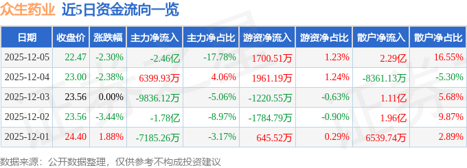 证券之星消息,截至2025年12月5日收盘,众生药业(002317)报收于22.47元,下跌2.3%,换手率8.03%,成交量61.15万手,成交额13.84亿元。