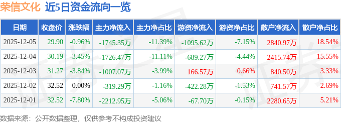 证券之星消息,截至2025年12月5日收盘,荣信文化(301231)报收于29.9元,下跌0.96%,换手率9.52%,成交量5.13万手,成交额1.53亿元。