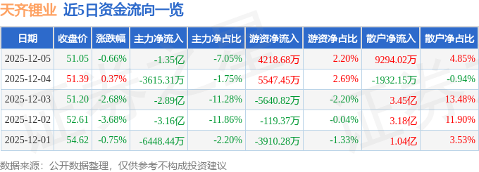 证券之星消息,截至2025年12月5日收盘,天齐锂业(002466)报收于51.05元,下跌0.66%,换手率2.55%,成交量37.69万手,成交额19.18亿元。