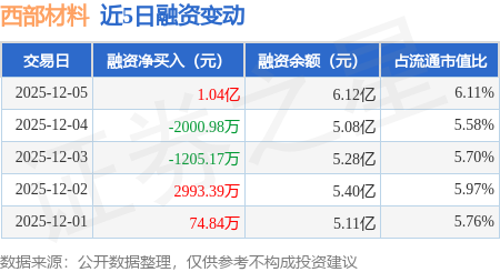 证券之星消息,12月5日,西部材料(002149)融资买入2.33亿元,融资偿还1.29亿元,融资净买入1.04亿元,融资余额6.12亿元,当日融资净买入排名第27。