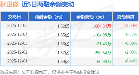 证券之星消息,12月5日,秋田微(300939)融资买入3228.9万元,融资偿还1564.55万元,融资净买入1664.34万元,融资余额1.52亿元。