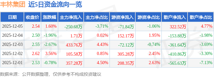 12月5日的资金流向数据方面,主力资金净流出250.68万元,占总成交额3.71%,游资资金净流出71.84万元,占总成交额1.06%,散户资金净流入322.52万元,占总成交额4.77%。