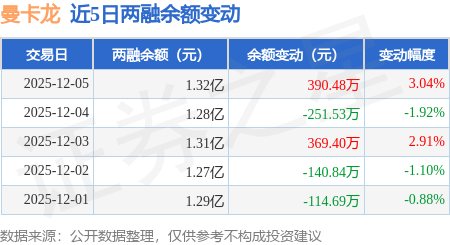 证券之星消息,12月5日,曼卡龙(300945)融资买入1327.95万元,融资偿还937.47万元,融资净买入390.48万元,融资余额1.32亿元。