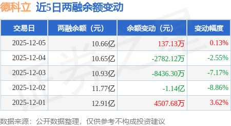 证券之星消息,12月5日,德科立(688205)融资买入2.45亿元,融资偿还2.43亿元,融资净买入137.13万元,融资余额10.66亿元,近20个交易日中有12个交易日出现融资净买入。