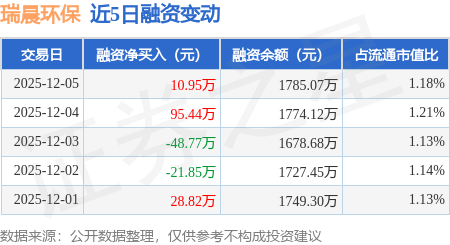 证券之星消息,12月5日,瑞晨环保(301273)融资买入140.62万元,融资偿还129.67万元,融资净买入10.95万元,融资余额1785.07万元,近20个交易日中有11个交易日出现融资净买入。
