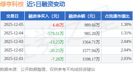 证券之星消息,12月5日,绿亨科技(920866)融资买入21.79万元,融资偿还17.32万元,融资净买入4.46万元,融资余额989.66万元。