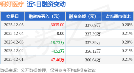 证券之星消息,12月5日,锦好医疗(920925)融资买入3.01万元,融资偿还2.71万元,融资净买入0.3万元,融资余额337.69万元。