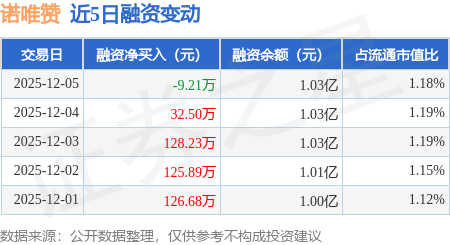 证券之星消息,12月5日,诺唯赞(688105)融资买入269.1万元,融资偿还278.31万元,融资净卖出9.21万元,融资余额1.03亿元,近20个交易日中有11个交易日出现融资净买入。