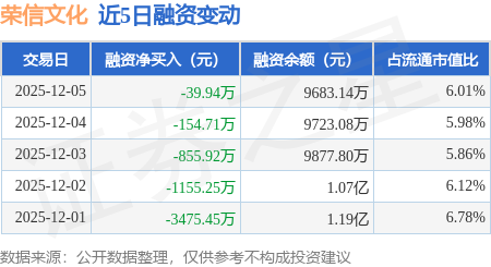 证券之星消息,12月5日,荣信文化(301231)融资买入1186.43万元,融资偿还1226.37万元,融资净卖出39.94万元,融资余额9683.14万元。