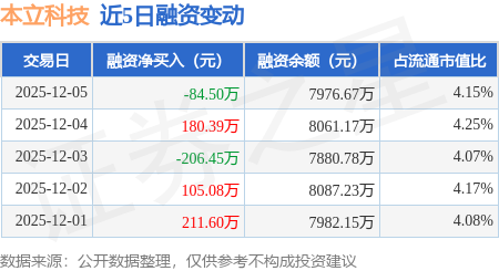 证券之星消息,12月5日,本立科技(301065)融资买入326.86万元,融资偿还411.35万元,融资净卖出84.5万元,融资余额7976.67万元,近20个交易日中有11个交易日出现融资净买入。
